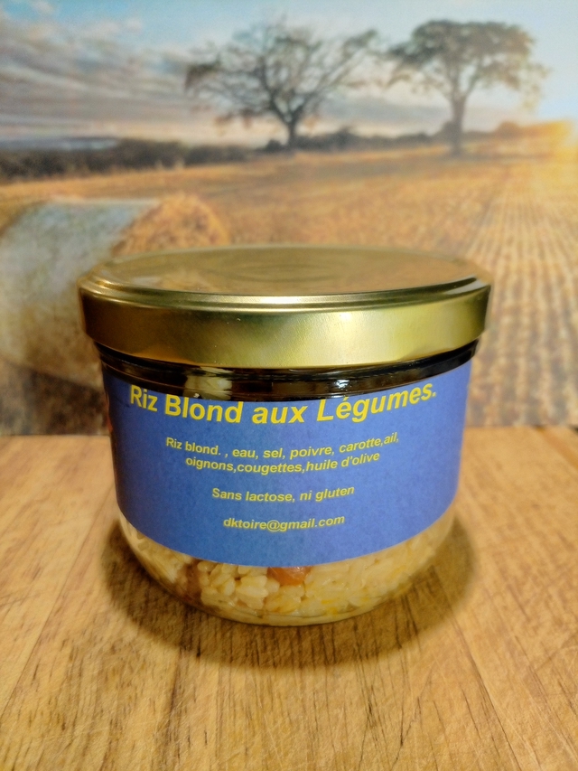 Ingrédients:Riz blond, eau, sel, poivre, carotte, ail, oignon, courgette, huile d'olive.